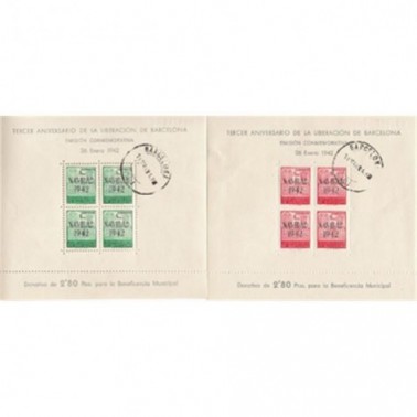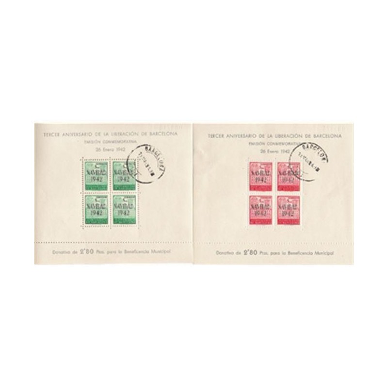 Vista rápida 1942 26 Ene. H.B. II... Referencia AYBA31/32 En stock 1 Precio 55,00 € 1941 II ANIVERSARIO DE LA LIBERACION DE BARCELONA Hojitas Bloques