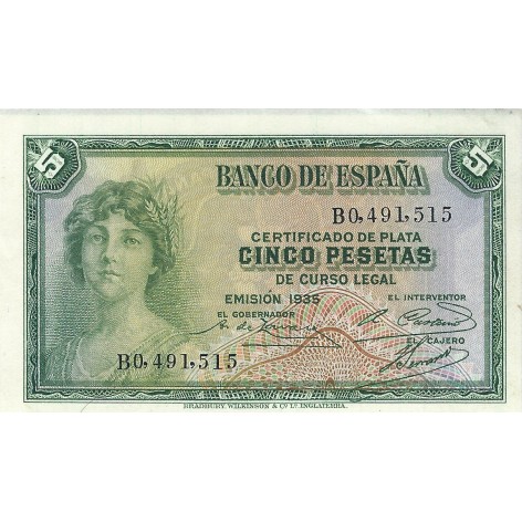 Vista rápida 1936 Emisión 5 Noviembre 10... Referencia BI404 En stock 1 Precio 45,00 € 1936 Emisión 5 Noviembre 5 Pesetas. Sin serie Banco de España - Gijón Vencimiento prorrogado Conservación BC