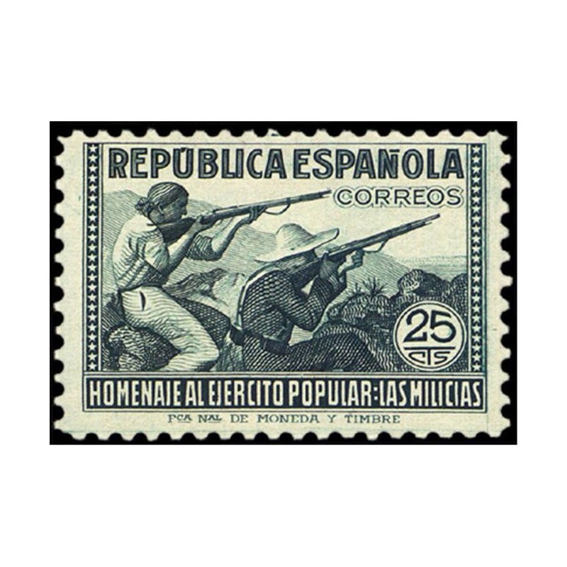 en él ángulo superior izquierdo "Nº 1", en el centro "República Española" y debajo en letras más pequeñas "Homenaje al Ejército Popular. "Las milicias"" y en el ángulo superior derecho "50 sellos de 5 pts" o del valor que corresponda.