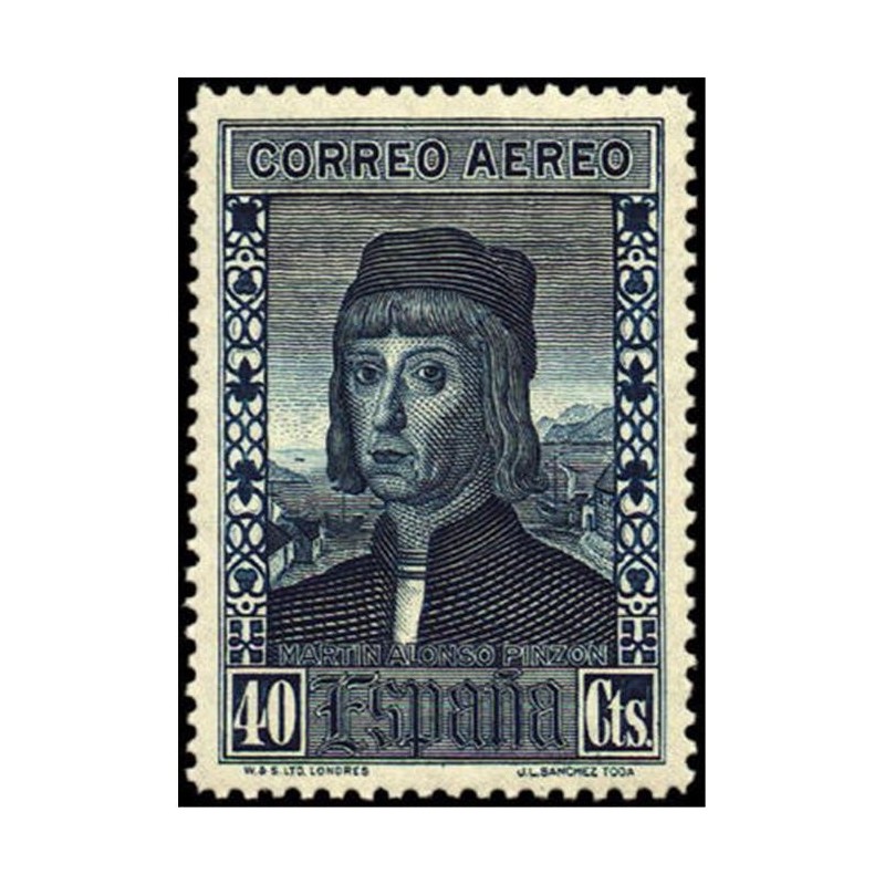 Los diseños de los sellos de correo aéreo para Europa reproducen el monasterio de La Rábida (5, 5, 10, 15 y 20 céntimos), supuesto retrato de Martín Alonso Pinzón (25 y 40 céntimos y 1 peseta), falso retrato de Vicente Yáñez Pinzón (30 y 50 céntimos) y la cámara de Colón en la "Santa María" (4 y 10 pesetas).