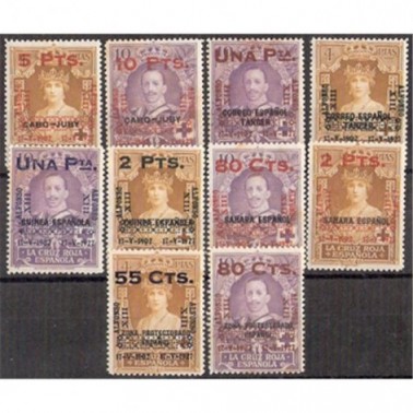 Sellos de 4 y 10 pesetas de la emisión de la Cruz Roja de 1926 para las oficinas españolas de Marruecos(M), Sahara (S), Tanger (T), Guinea (G) y Cabo Jubi (CJ), habilitados para España con o sin nuevo valor.