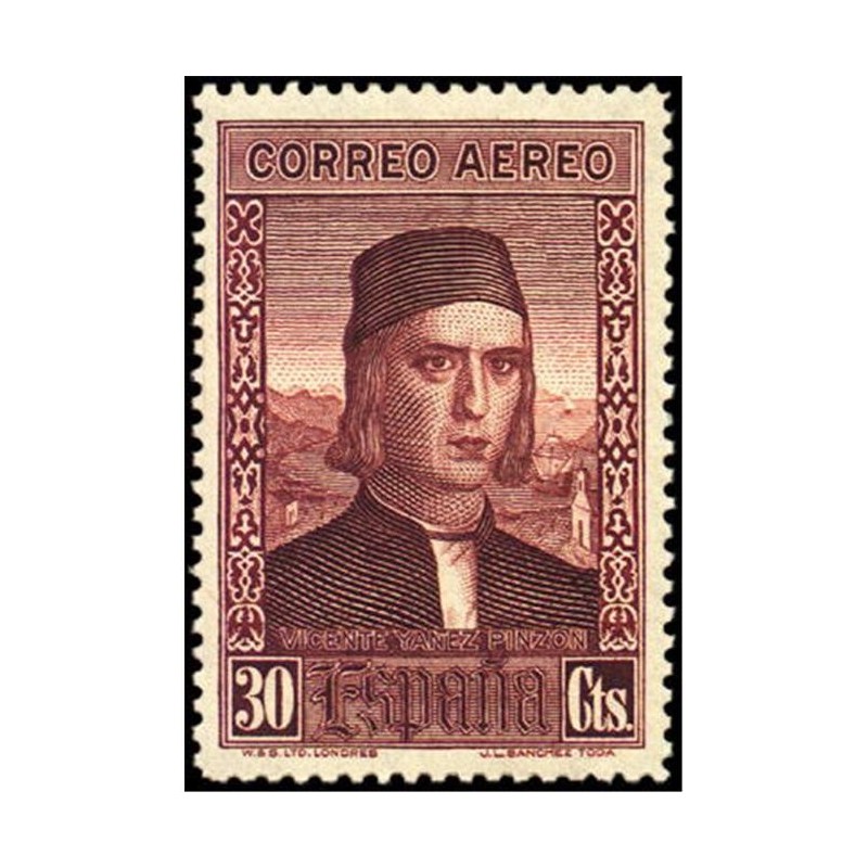 Los diseños de los sellos de correo aéreo para Europa reproducen el monasterio de La Rábida (5, 5, 10, 15 y 20 céntimos), supuesto retrato de Martín Alonso Pinzón (25 y 40 céntimos y 1 peseta), falso retrato de Vicente Yáñez Pinzón (30 y 50 céntimos) y la cámara de Colón en la "Santa María" (4 y 10 pesetas).