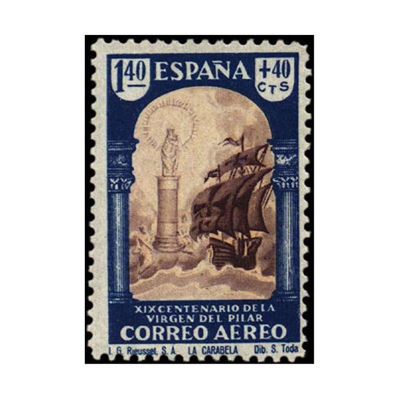 Texto de la cabecera: Emisión extraordinaria conmemorativa del XIX centenario de la Virgen del Pilar.- Correo aéreo.- 100 sellos de 40 cts + 10 cts, o del valor que proceda.