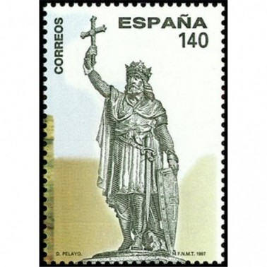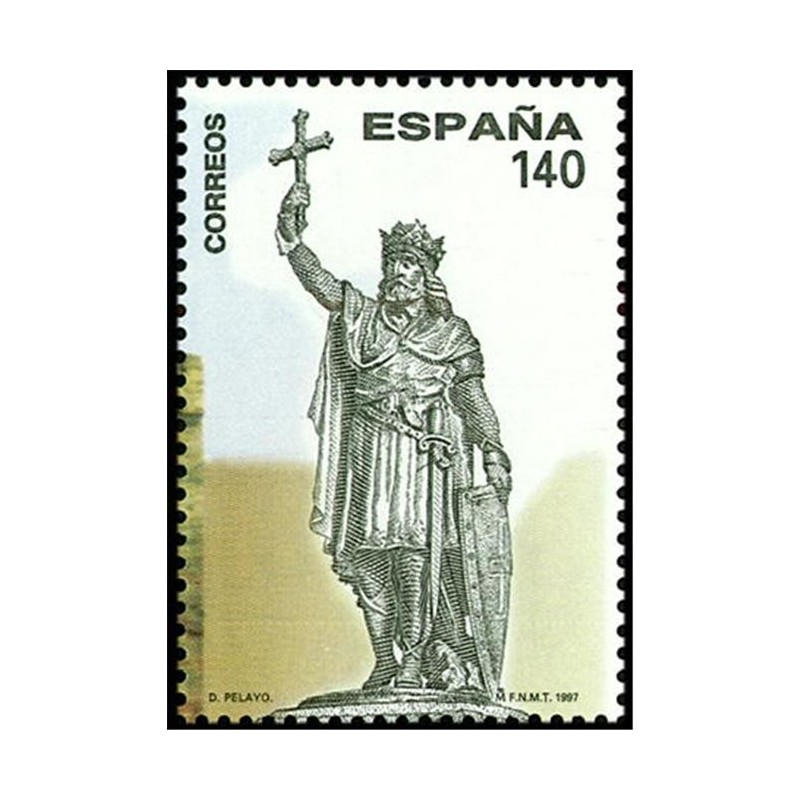 Motivo: Monumento de Don Pelayo con la Cruz de la Victoria en alto, modelado en bronce por José Mª López. Se completa con la fachada principal del Palacio de Revillagigedo (s. XVIII).