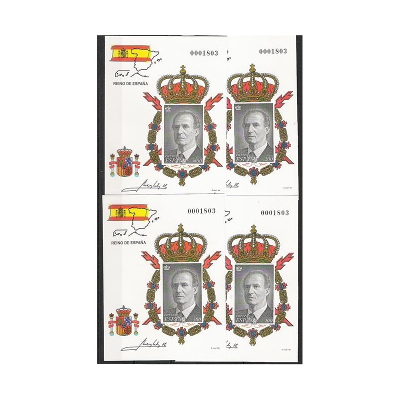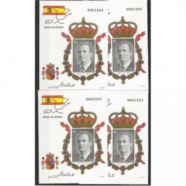 Carterita de 145 x 105 mm. con las dos hojitas anteriores, las cuatro pruebas y unas páginas con la biografía y fotografías del Rey. Precio de venta: 10.000 pesetas. Tirada 40.000.