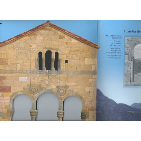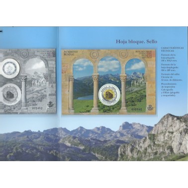 2017 MONUMENTOS DE OVIEDO Y EL REINO DE ASTURIAS - SANTA MARIA DEL NARANCO - DESPLEGABLE CERRADO EN DIPTICO CONMEMORATIVO TROQUELADO CON LA HB DEL PATRIMONIO MUNDIAL DEL ACUEDUCTO DE SEGOVIA Nº 5149 Y LA PRUEBA DE ARTISTA CON LA MONEDA DE 2 € DE SANTA MARIA DEL NARANCO, TIRADA 3.500 UNIDADES