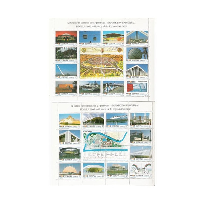 Motivos: 3188, Se completa con una vista de la ciudad de Sevilla, grabado de la obra "Civitatis Urbis Terrarum" (s. XVI); 3189, Se completa con un croquis de la Planta General del recinto de la EXPO. Diseños de Mariano Salamanca y A. Millán.