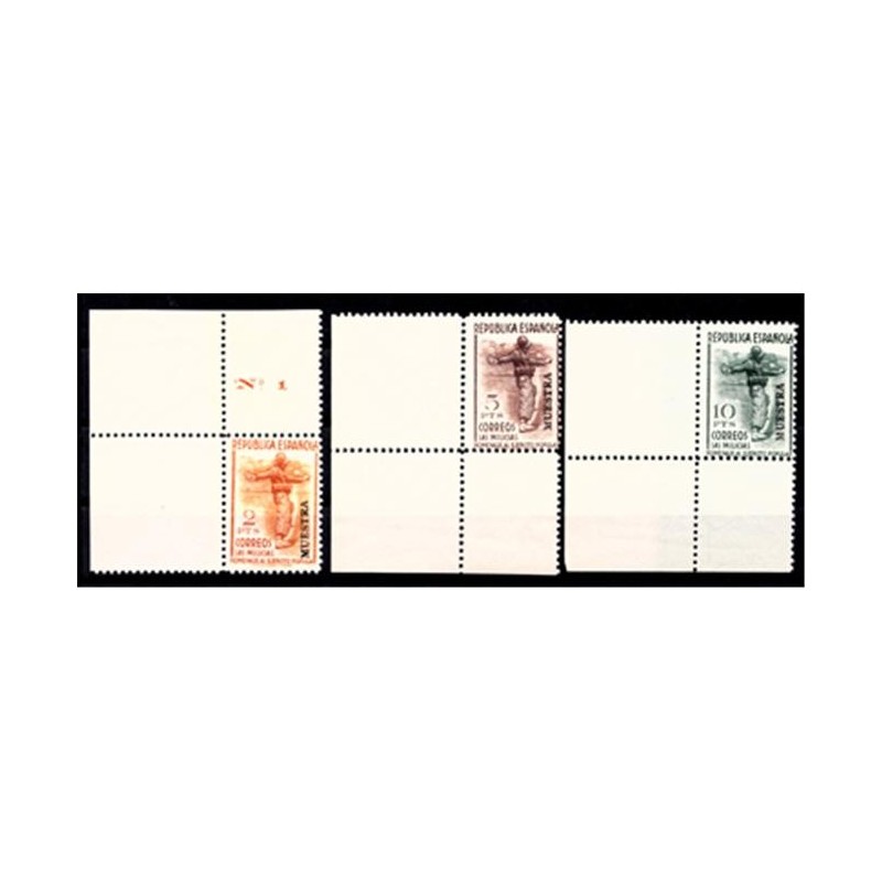 en él ángulo superior izquierdo "Nº 1", en el centro "República Española" y debajo en letras más pequeñas "Homenaje al Ejército Popular. "Las milicias"" y en el ángulo superior derecho "50 sellos de 5 pts" o del valor que corresponda.