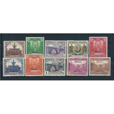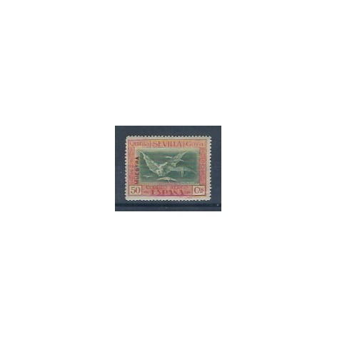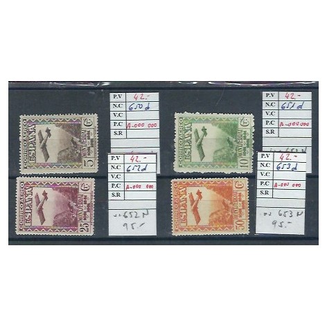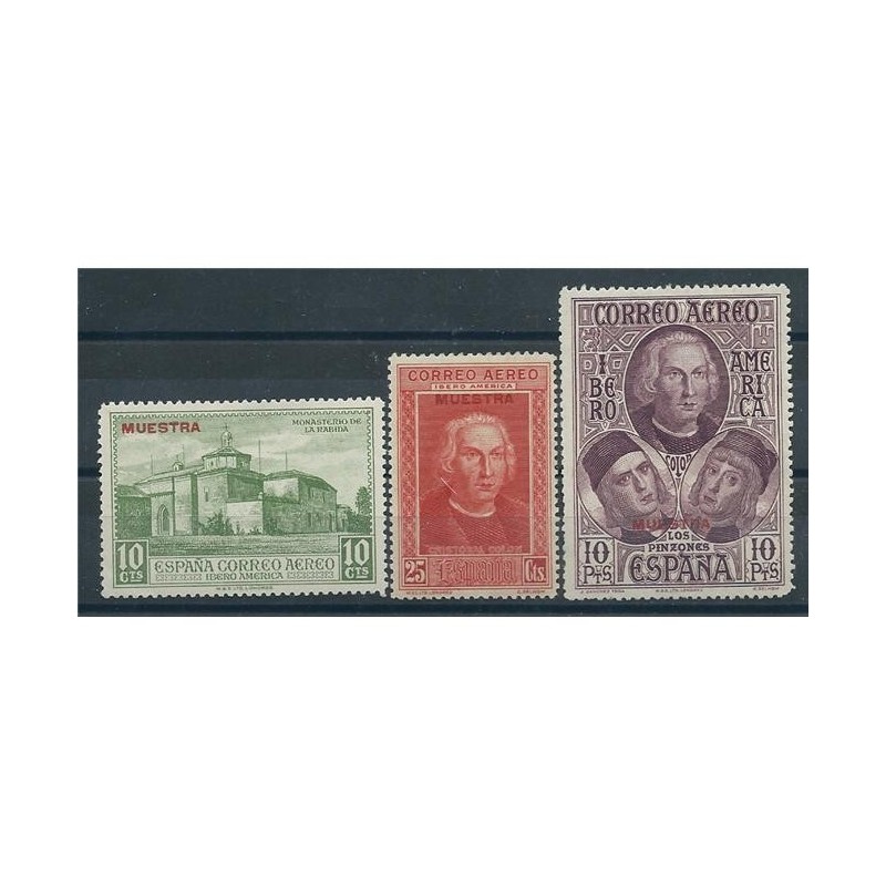 Conmemorativos del Descubrimiento de América. Real orden del Ministerio de Hacienda de 23 de abril de 1930, comunicada a la Dirección general de Comunicaciones según circular de 1 de mayo de 1930 (D.O. de C. del 5) sobre creación y Real orden del Ministerio de Hacienda de 25 de junio de 1930 comunicada a la Dirección general de Comunicaciones según circular de 8 de julio de 1930 (D.O. de C. del 12) sobre circulación de los sellos. Los diseños de los sellos de correo aéreo para América reproducen el monasterio de La Rábida (5 y 10 céntimos), retrato de Colón de autor desconocido (25 y 50 céntimos y 1 peseta) y composición con los retratos de los tres navegantes (4 y 10 pesetas). Grabados por José López Sánchez Toda (flota de Colón, hermanos Pinzón y cámara de Colón), Camilo Delhom (salida de Colón, desembarco de Colón y retrato de Colón) y personal de Waterlow los diseños de la nao "Santa María" y del monasterio de La Rábida. Impresos en litografía (1 a 20 céntimos de correo ordinario, correo urgente y 5 a 20 céntimos de correo aéreo) y en calcografía (los demás) en Waterlow and Sons Ltd., Londres. Tamaño: 48 por 33 milímetros (nao "Santa María" y monasterio de La Rábida), 36 por 49 milímetros (salida y desembarco de Colón, cámara de Colón), 37 por 72 milímetros de formato triangular (flota de Colón), 39 por 27 milímetros (retratos de los hermanos Pinzón), 41 por 28 milímetros (retrato de Colón) y 52 por 38 milímetros (composición con los retratos de los tres navegantes). Pliegos de 25 sellos en cinco filas horizontales de cinco sellos cada una; las planchas de impresión en litografía tienen cuatro pliegos por hoja. Los pliegos de los sellos triangulares tienen cinco espacios triangulares con dos tipos de adornos diferentes y un espacio cuadrado donde figura la inscripción del contenido. Texto de la cabecera: "25 sellos de 4 pts." o del valor que corresponda. Papel blanco y goma en capa ligera. Dentados 12 1/2 de línea. Circulación en 29 de septiembre de 1930. Validez postal hasta 1 de octubre de 1930. Tirada: 559: 1.651s.000 560: 776.000 561: 503.000 562: 266.000 563: 262.500 564: 112.900 565: 88.800.