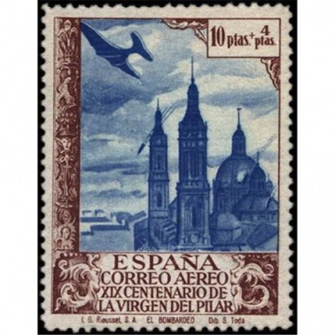 Texto de la cabecera: Emisión extraordinaria conmemorativa del XIX centenario de la Virgen del Pilar.- Correo aéreo.- 100 sellos de 40 cts + 10 cts, o del valor que proceda.