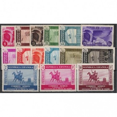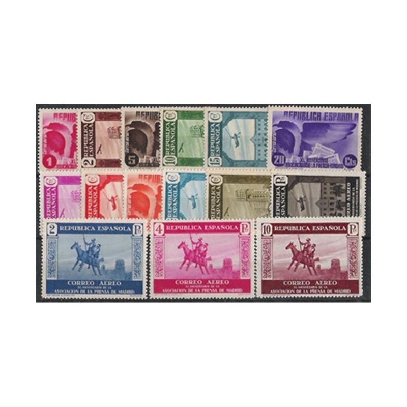 Motivos: Corresponden a un dibujo estilizado del águila de los Pirineos (1, 5, 20 y 40 céntimos), vista del Palacio de la Prensa de Madrid (2, 10, 25 y 60 céntimos), fachada de la "Casa de Nazareth" (15, 30 y 50 céntimos y 1 peseta), el engañoso viaje sideral de Don Quijote y Sancho en el caballo de madera, según "El ingenioso caballero Don Quijote de la Mancha" (2, 4 y 10 pesetas).