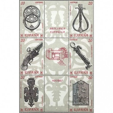 Motivos: 3061, Aragón. Llamador o aldabón de forja de siglo XV, Museo Provincial del Teruel; 3062, Andalucía. Aldaba realizada en Ronda (Málaga) en el siglo XVI; 3063, Cataluña. Pistola del siglo XVII producida en la Farga Catalana, Museo Fol-klórico de Ripoll (Gerona); 3064, Castilla-La Mancha. Llamador realizado en Cuenca entre los siglos XVII y XVIII; 3065, Galicia. Espejo de cerradura, Museo do Pobo Galego, de Santiago de Compostela; 3066, Pais Vasco. Transfuego del siglo XVIII, procedente de Vizcaya, Museo Arqueológico y Etnológico de Bilbao. Diseño de Miguel Ángel Escobar. Grabados, respectivamente, por J. Manuel Mata, Jesús Terriza, Antonino Sánchez, Alfredo de Oro, Julián González de la Lastra y Pablo Sampedro.