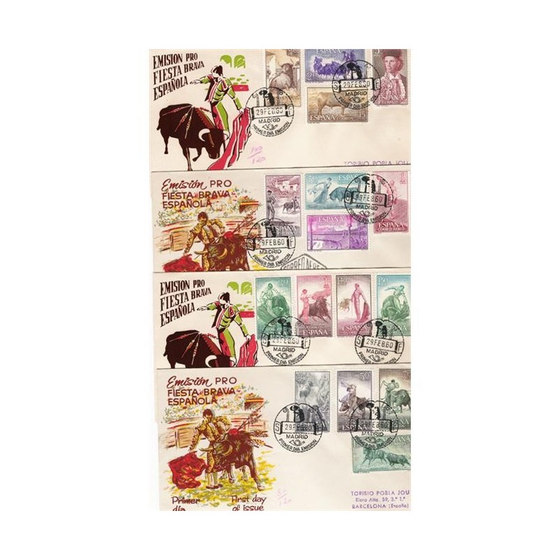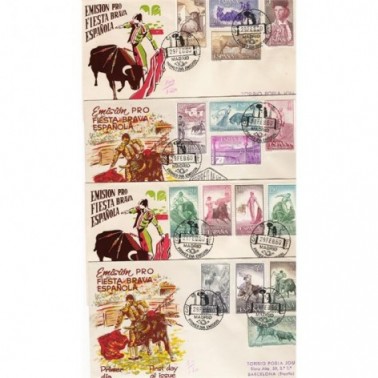 Motivos: 1254, Toro de lidia; 1255, Toros en el campo; 1256, Encierro en Pamplona; 1257, Salida del toril; 1258, toreo de capa. Farol; 1259, Suerte de banderillas; 1260, Toreo de muleta. Derechazo; 1261, Toreo de muleta. Pase por alto; 1262, Citando al toro; 1263, Toreo de muleta. Natural; 1264, Toreo a caballo; 1265, Paquiro; 1266, Plaza de pueblo; 1267, Quite de frente por detrás; 1268, Brindis; 1269, Plaza de la Maestranza, Sevilla.
