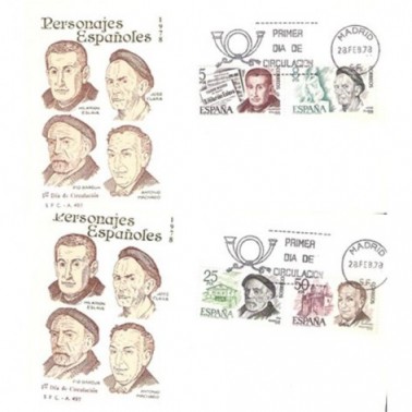 O. M. de 21 de diciembre de 1977. Motivos: 2456, Busto del compositor Miguel Hilarión Eslava (1807-1878), según óleo propiedad del Real Conservatorio Superior de Música de Madrid y fragmento de la partitura musical de su célebre composición "Miserere"; 2457, Busto del escultor José Clará Ayats (1878-1958), tomado de un apunte del mismo Clará y reproducción de su obra "La Diosa", instalada en la plaza de Cataluña de Barcelona; 2458, Busto de Pío Baroja (1872-1856) y caserío vasco; 2459, Busto de Antonio Machado (1875-1939) y silueta de la Ermita de San Saturio, en Soria. Impresos en calcografía. Tamaño: 40,9 x 24,9 mm. Pliegos de: 25 sellos. Dentado 13 1/4 x 12 3/4. Tiradas: 2456 y 2457: 10.000.000 2458 y 2459: 20.000.000.
