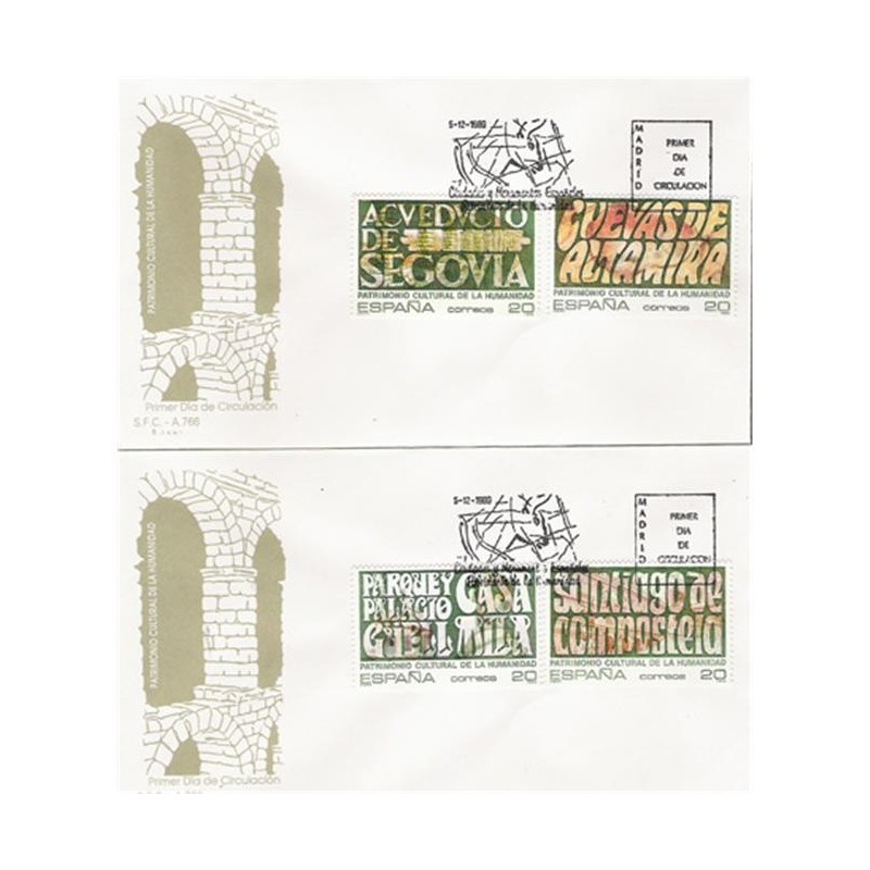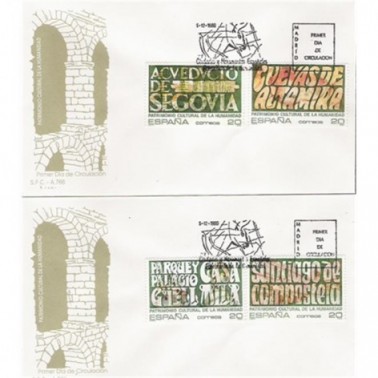Motivos: 3038, Parque y palacio Güell y Casa Milá, de Barcelona, obras de Antonio Gaudí (1852-1926); 3039, Cuevas de Altamira (Cantabria), descubiertas en 1868; 3040, Ciudad Vieja de Segovia y su Acueducto; 3041, Ciudad de Santiago de Compostela.