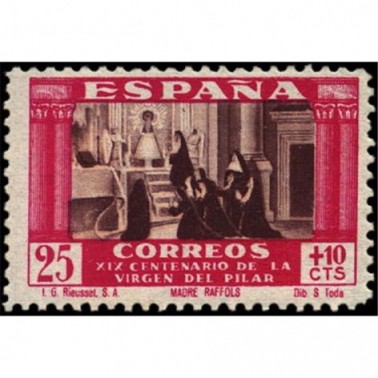 Texto de la cabecera: Emisión extraordinaria conmemorativa del XIX centenario de la Virgen del Pilar.- Correo ordinario.- 100 sellos de 40 cts + 10 cts, o del valor que proceda.