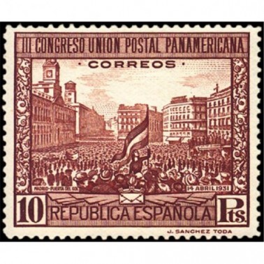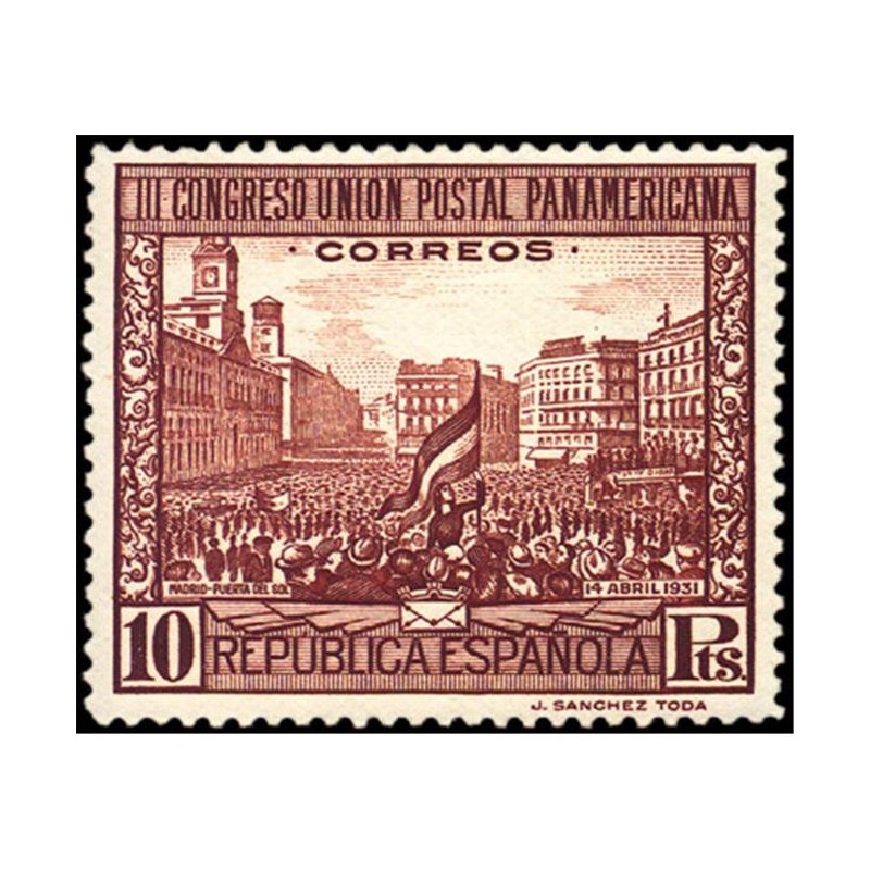 Los diseños de los sellos de correo ordinario corresponden a fuente del Patio de Leones de la Alhambra de Granada (5 y 40 céntimos), interior de la mezquita de Córdoba (10, 25 y 50 céntimos), puente de Alcántara de Toledo (15 céntimos y 1 peseta), retrato de busto de don Francisco García Santos, promotor de la Unión Postal Panamericana (30 céntimos) y vista de la Puerta del Sol, en Madrid, el 14 de abril de 1931 (4 y 10 pesetas), éste último realizado por José López Sánchez-Toda. Los de correo aéreo reproducen una vista de Madrid desde el oeste (5, 10 y 15 céntimos), la fuente de Cibeles en Madrid, con el Palacio de Comunicaciones al fondo (50 céntimos y 1 peseta) y una vista de la calle de Alcalá de Madrid (4 pesetas); estos diseños fueron realizados por José López Sánchez-Toda, por sugerencia de don Manuel Gálvez Rodríguez.