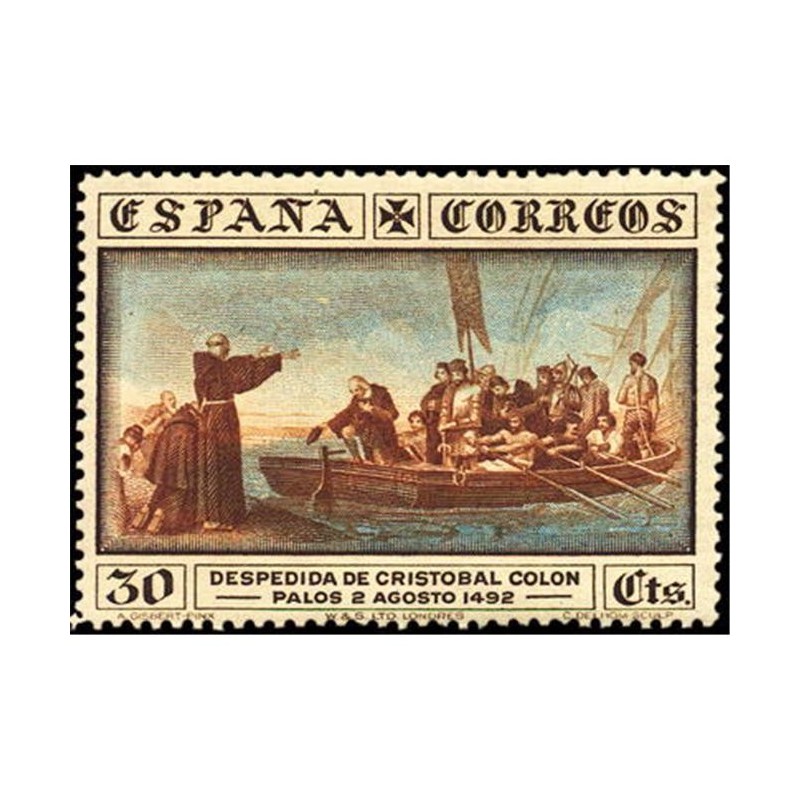 Grabados por José López Sánchez Toda (flota de Colón, hermanos Pinzón y cámara de Colón), Camilo Delhom (salida de Colón, desembarco de Colón y retrato de Colón) y personal de Waterlow los diseños de la nao "Santa María" y del monasterio de La Rábida.