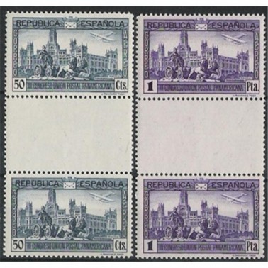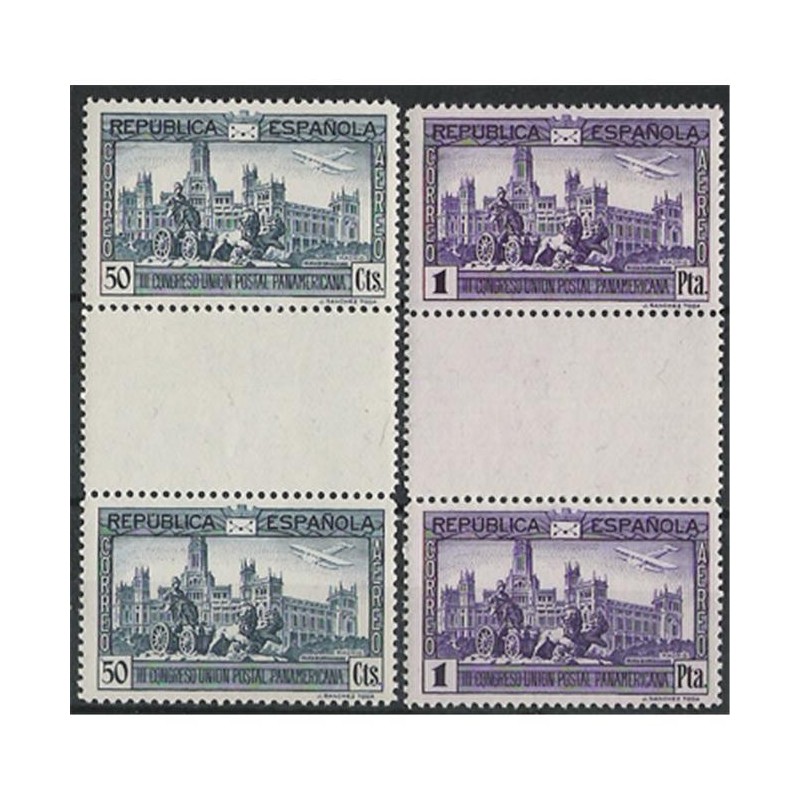 Los diseños de los sellos de correo ordinario corresponden a fuente del Patio de Leones de la Alhambra de Granada (5 y 40 céntimos), interior de la mezquita de Córdoba (10, 25 y 50 céntimos), puente de Alcántara de Toledo (15 céntimos y 1 peseta), retrato de busto de don Francisco García Santos, promotor de la Unión Postal Panamericana (30 céntimos) y vista de la Puerta del Sol, en Madrid, el 14 de abril de 1931 (4 y 10 pesetas), éste último realizado por José López Sánchez-Toda. Los de correo aéreo reproducen una vista de Madrid desde el oeste (5, 10 y 15 céntimos), la fuente de Cibeles en Madrid, con el Palacio de Comunicaciones al fondo (50 céntimos y 1 peseta) y una vista de la calle de Alcalá de Madrid (4 pesetas); estos diseños fueron realizados por José López Sánchez-Toda, por sugerencia de don Manuel Gálvez Rodríguez.