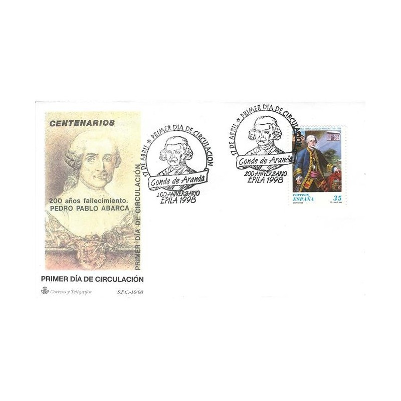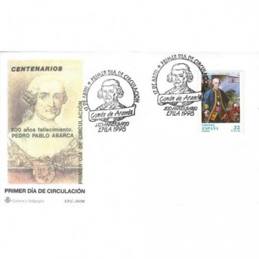 D. 13 3/4; I. huecograbado; T. 2.500.000; Pl. 50. Motivo: II centenario del fallecimiento de Pedro Pablo Abarca, Conde de Aranda. Retrato de Juan José Badenes Miralles.